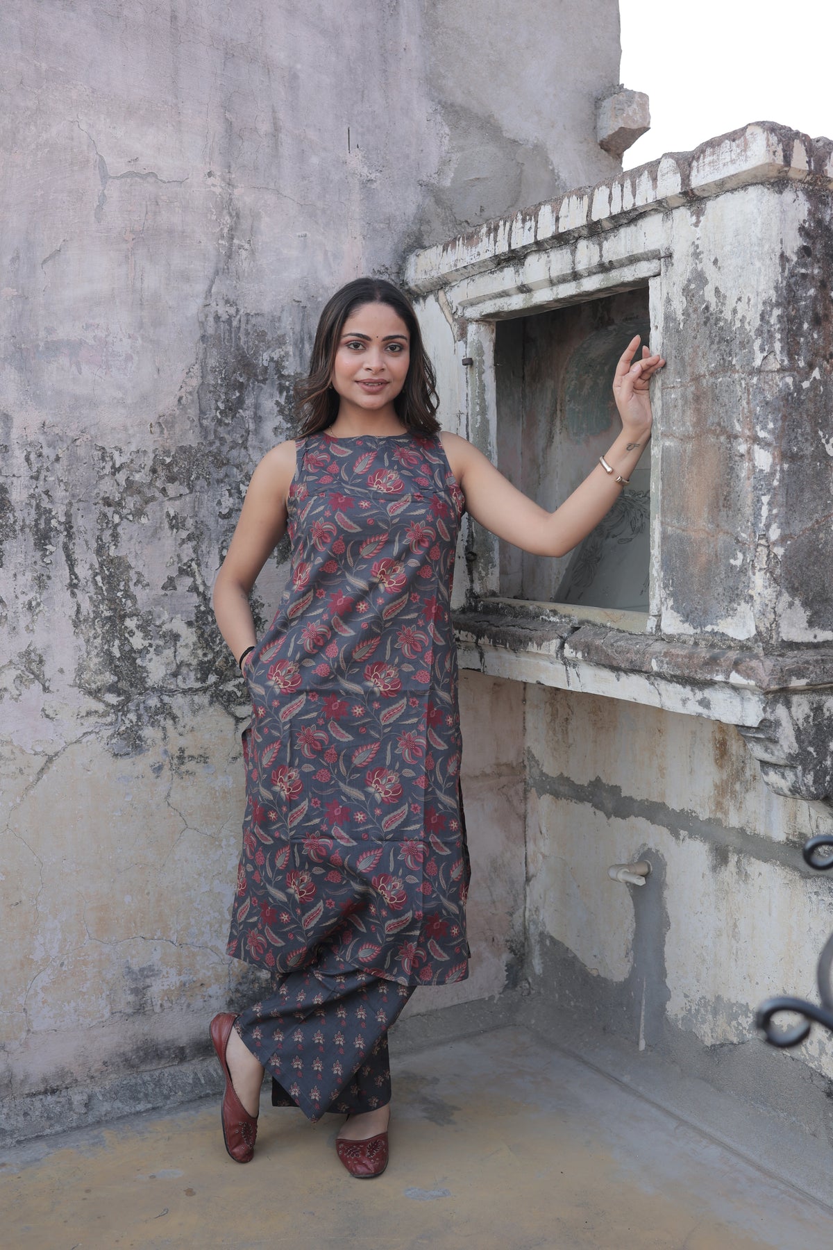 • The Set: A complete coordinated ensemble featuring a long sleeveless straight kurta and matching printed wide-leg pants.